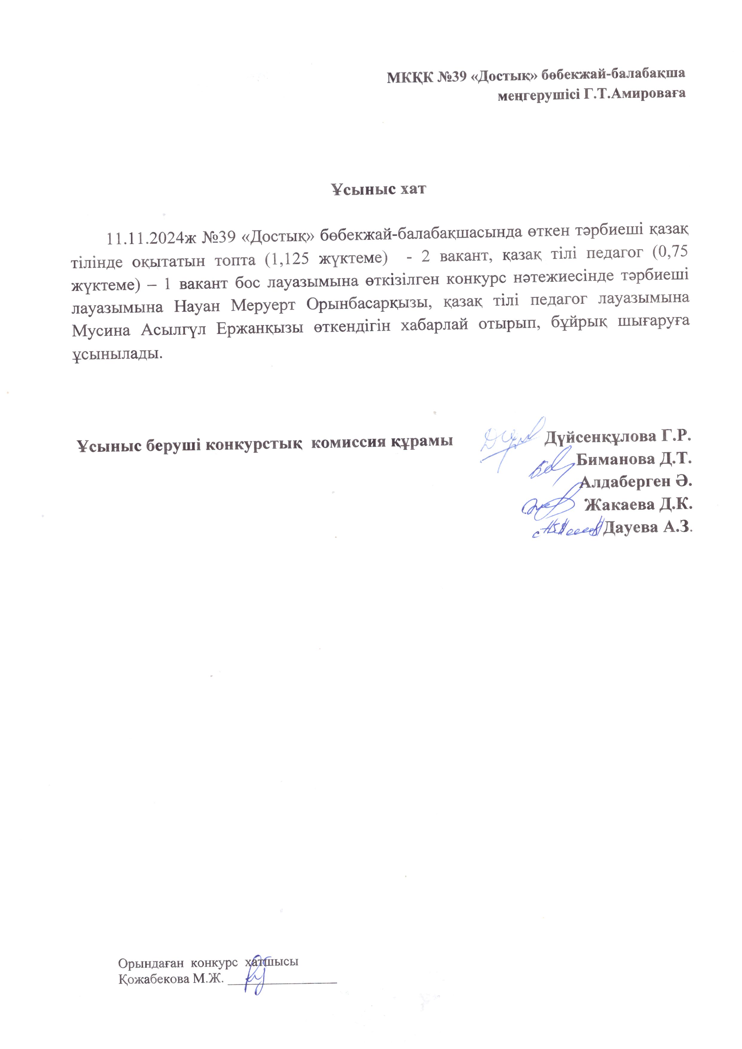08.11.2024 г. в ГККП ясли-саду №39 «Достық» на основании приказа Министерства образования и науки РК №57 от 21.02.2012 г. «Об утверждении правил назначения на должности, освобождения от должностей первых руководителей и педагогов государственных организаций образования» Конкурсная комиссия рассмотрела документы кандитатов на соответствие квалификационным требованиям, утвержденные Типовыми квалификационными требованиями педагогов.